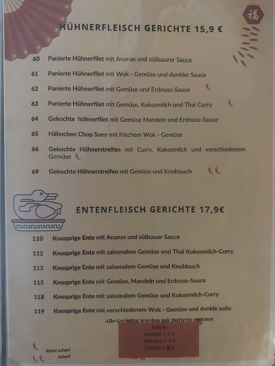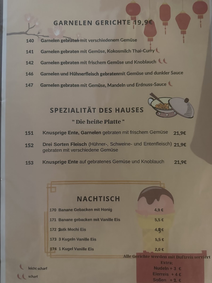 Customer reviews highlight the inviting nature of the restaurant. As one visitor, Andrea G., noted, "Das Essen kam recht zügig, die Bedienung freundlich" — the food arrives promptly, and the staff is friendly. She praised the crispy duck, although it was served lukewarm; the portion size was generous, which is always appreciated. Another guest, David Jahnke, appreciated the large menu, emphasizing the abundance of options available, making it a great spot for any group.